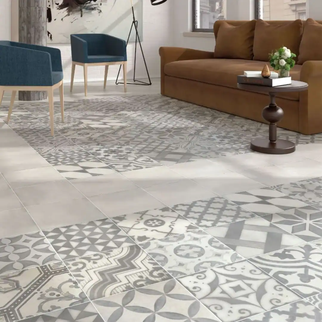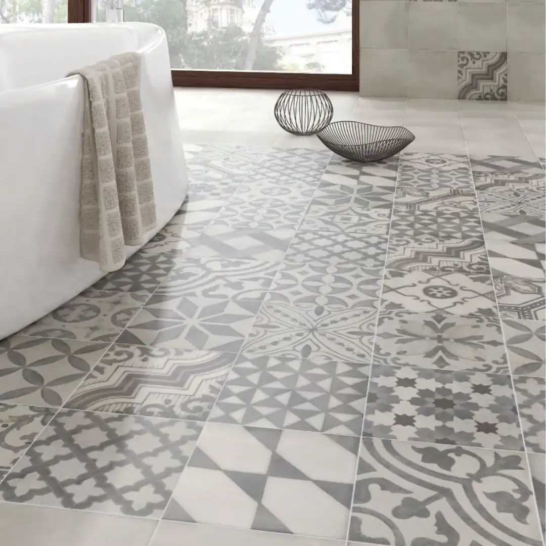 The 1920s collection celebrates vintage charm with a modern touch. Made from durable porcelain, these Victorian-patterned tiles feature intricate geometric and floral motifs inspired by early 20th-century design. Their subtle tones of grey and white bring elegance and versatility to both contemporary and traditional interiors.