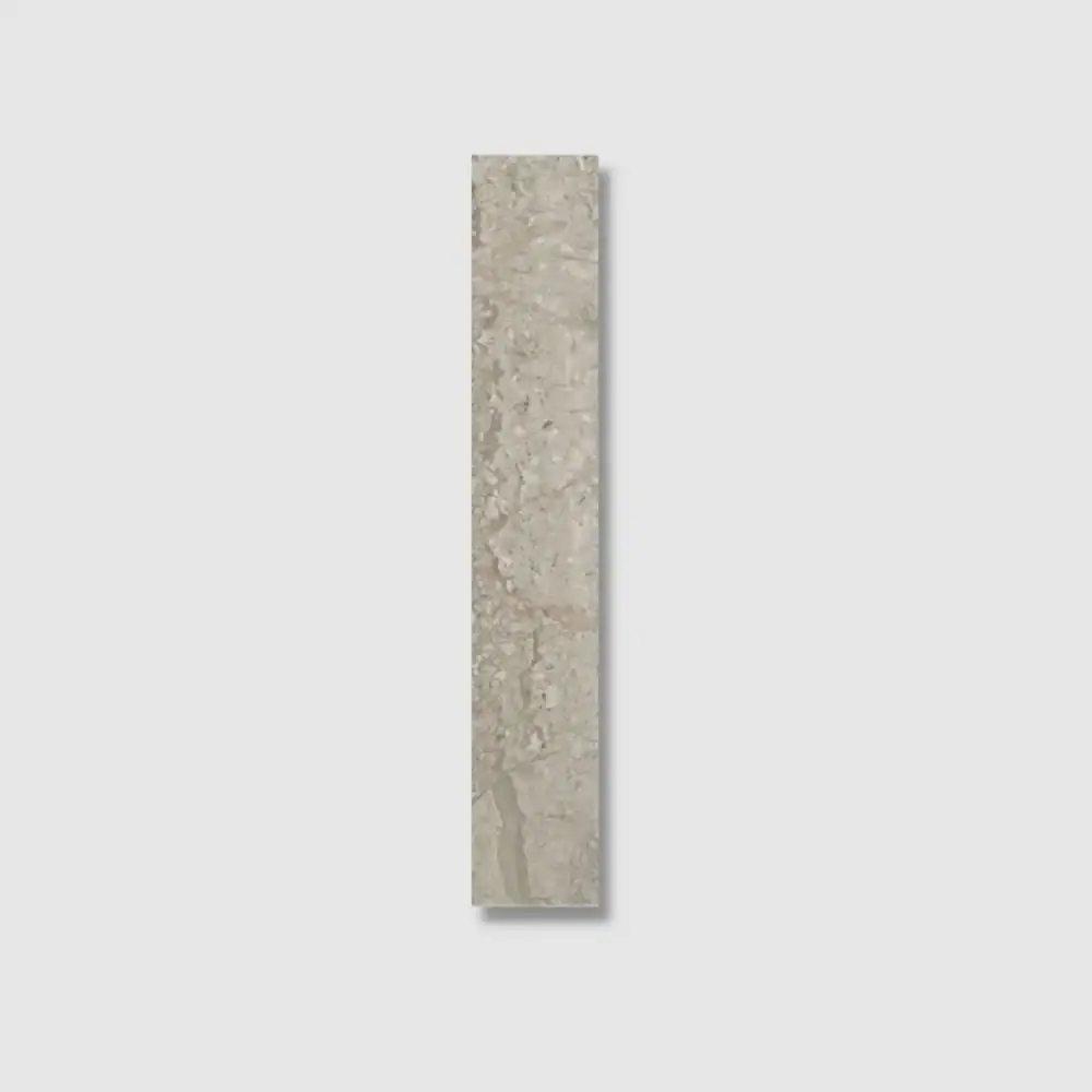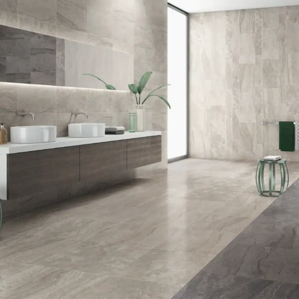 The grey stone effect tile style matches well with soft colour palettes, minimalist interiors, and metallic details.