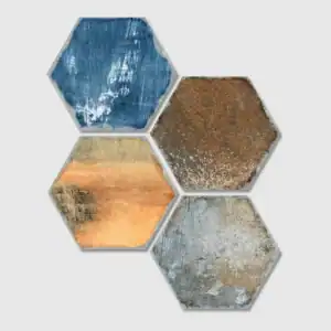 The Hex Dorne 22×25 tile combines a rich blend of earthy and blue tones with a natural matt finish. Its hexagonal shape and dynamic colour variation create a warm, rustic look with a contemporary edge. Made of durable porcelain, it’s suitable for floors and walls in kitchens, bathrooms, and living spaces.