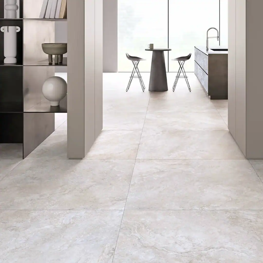 With its 61×61 cm format, it’s ideal for living rooms, bathrooms, and terraces, offering a seamless transition between indoor and outdoor areas. The soft detailing captures the calm of travertine stone in a modern way.