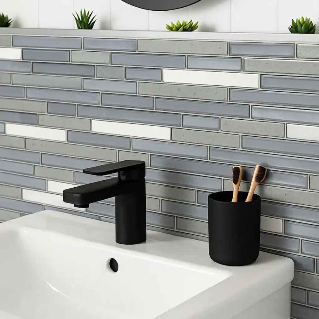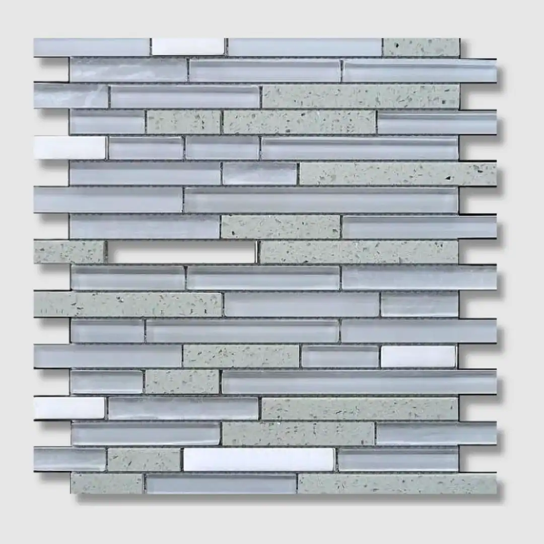 Reflection White is a sleek and modern mosaic tile that blends ceramic and glass materials into a harmonious design. Offered in a 30×30 cm format, this tile features long, narrow pieces in soft shades of white, light grey, and frosted glass. The result is a crisp, linear pattern that reflects light and adds visual texture to any space.